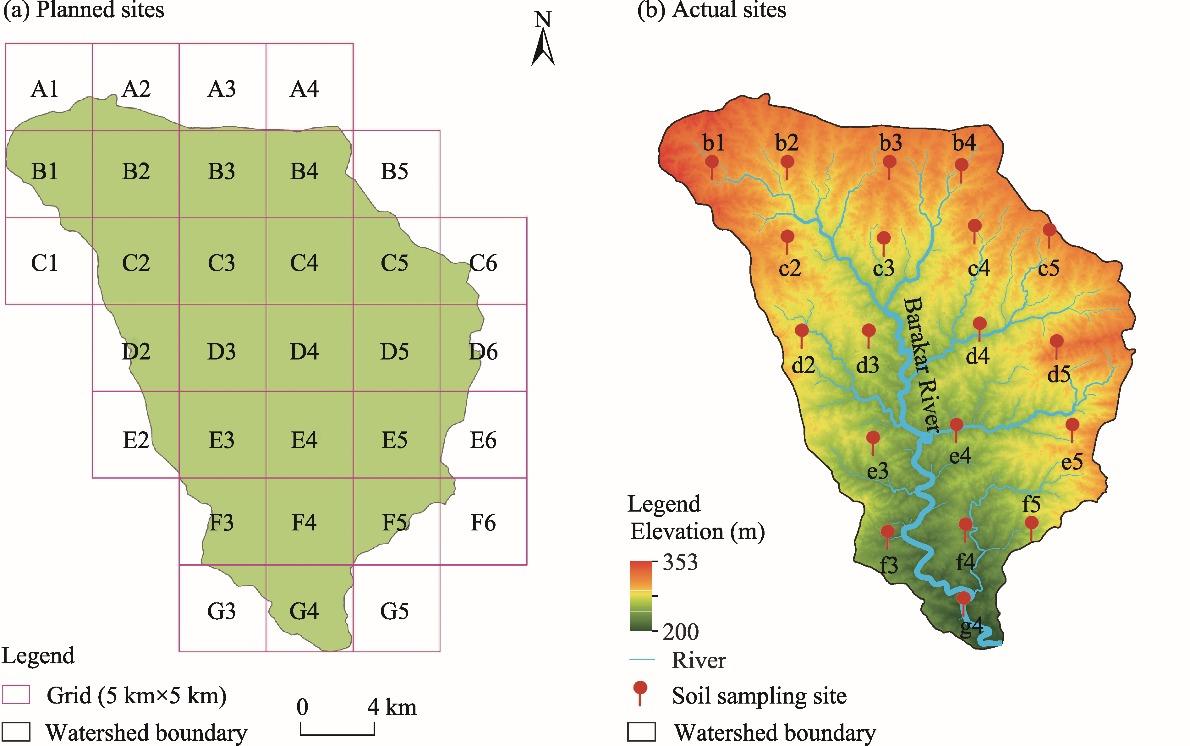 Fig. 1. Planned (a) and actual (b) sites of soil sample collection in the study area. |