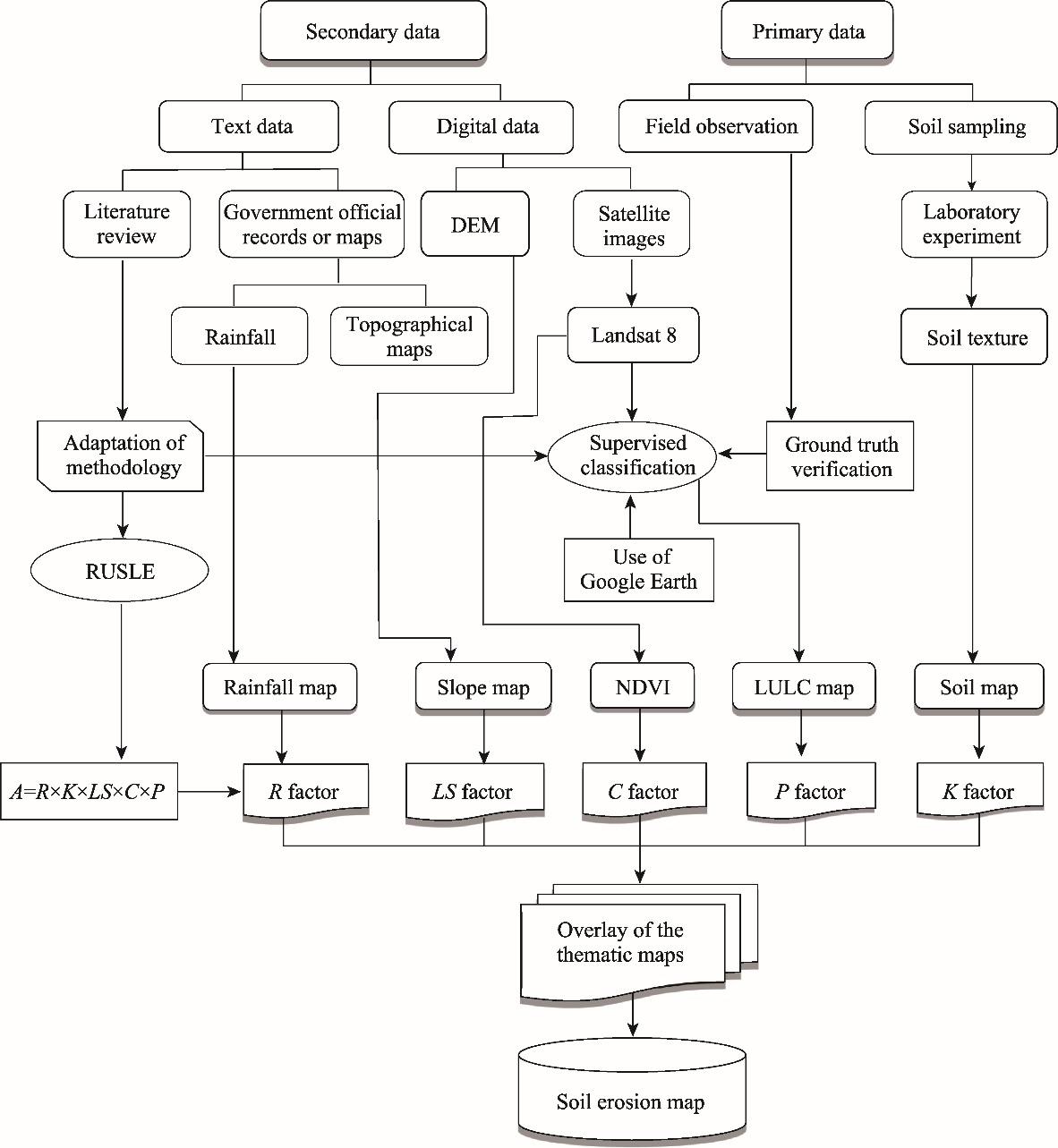 Fig. 2. Methodological flow chart of this study. DEM, digital elevation model; NDVI, Normalized Difference Vegetation Index; LULC, land use and land cover; RUSLE, Revised Universal Soil Loss Equation; A, average annual rate of soil erosion; R, rainfall-runoff erosivity; LS, slope length and steepness; C, cover-management; P, support practice; K, soil erodibility. |