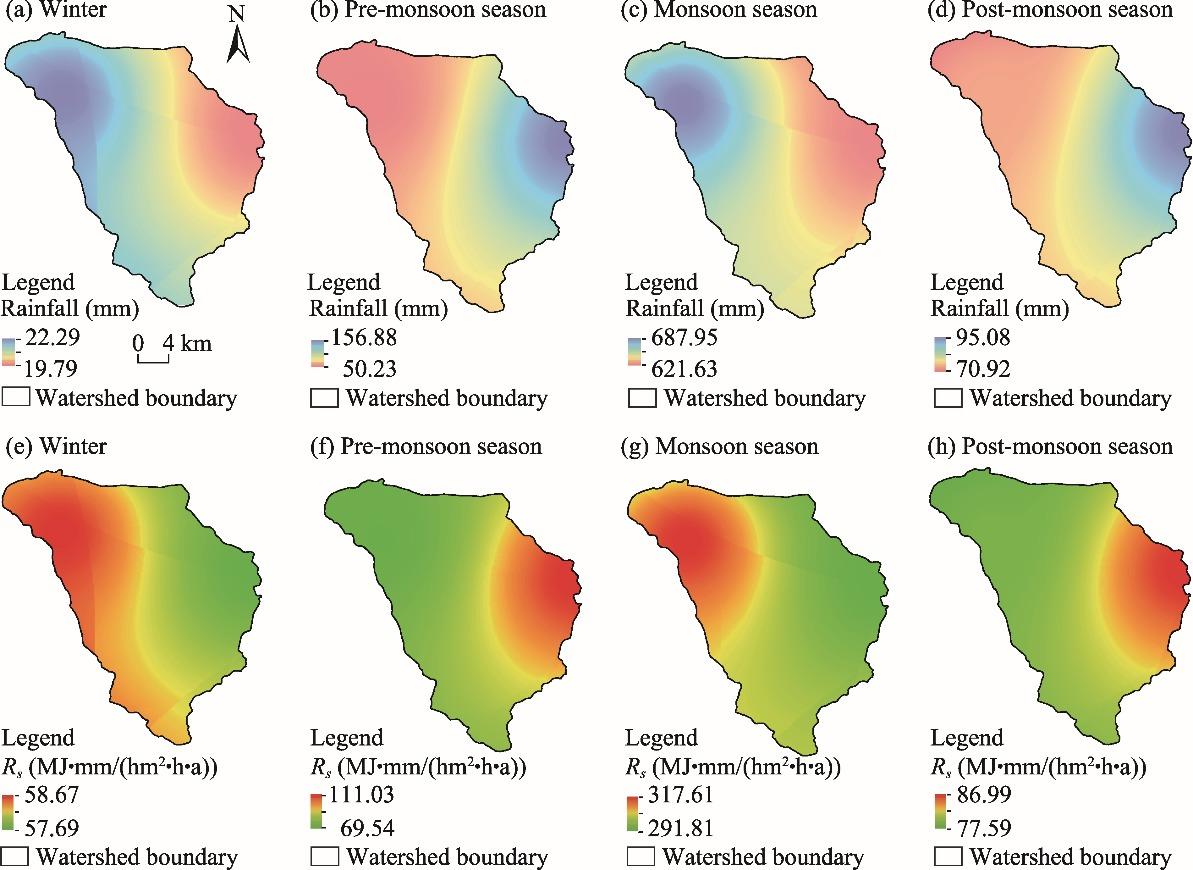Fig. 4. Spatial distribution of rainfall in winter (a), pre-monsoon season (b), monsoon season (c), and post-monsoon season (d), as well as spatial distribution of seasonal erosion index (Rs) in winter (e), pre-monsoon season (f), monsoon season (g), and post-monsoon season (h). |