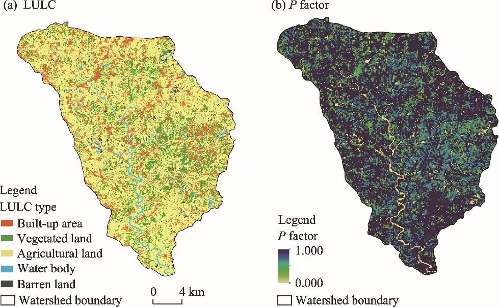 Fig. 9. Spatial distribution of LULC (a) and the P factor (b). |