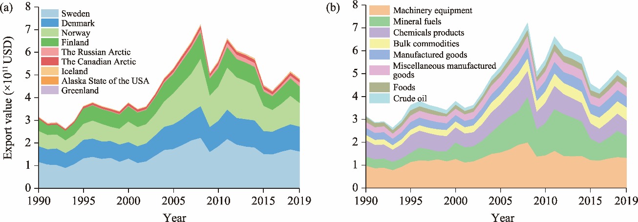 Fig. 1. Changes in export strength (a) and export structure (b) in the Arctic region from 1990 to 2019. |