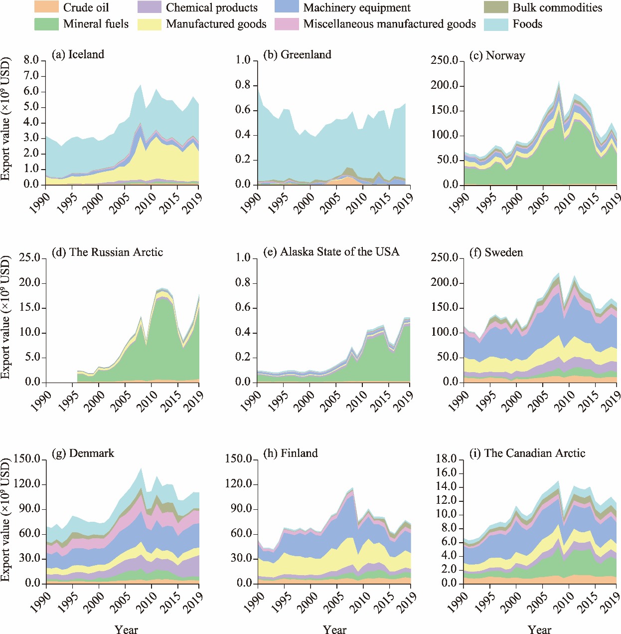 Fig. 2. Trends in product categories exported from the Arctic region by country or region from 1990 to 2019. (a), Iceland; (b), Greenland; (c), Norway; (d), the Russian Arctic; (e), Alaska State of the USA; (f), Sweden; (g), Denmark; (h), Finland; (i), the Canadian Arctic. |