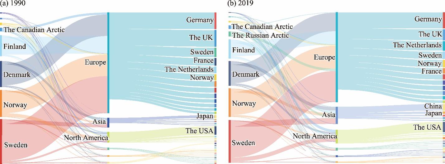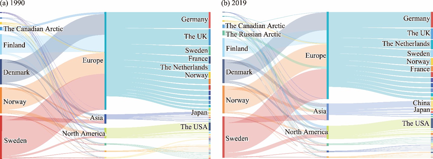 Fig. 5. Export trade network of the Arctic region to continents and major countries in 1990 (a) and 2019 (b). |