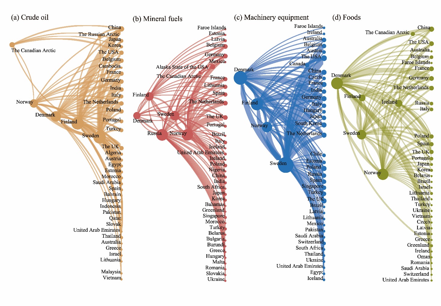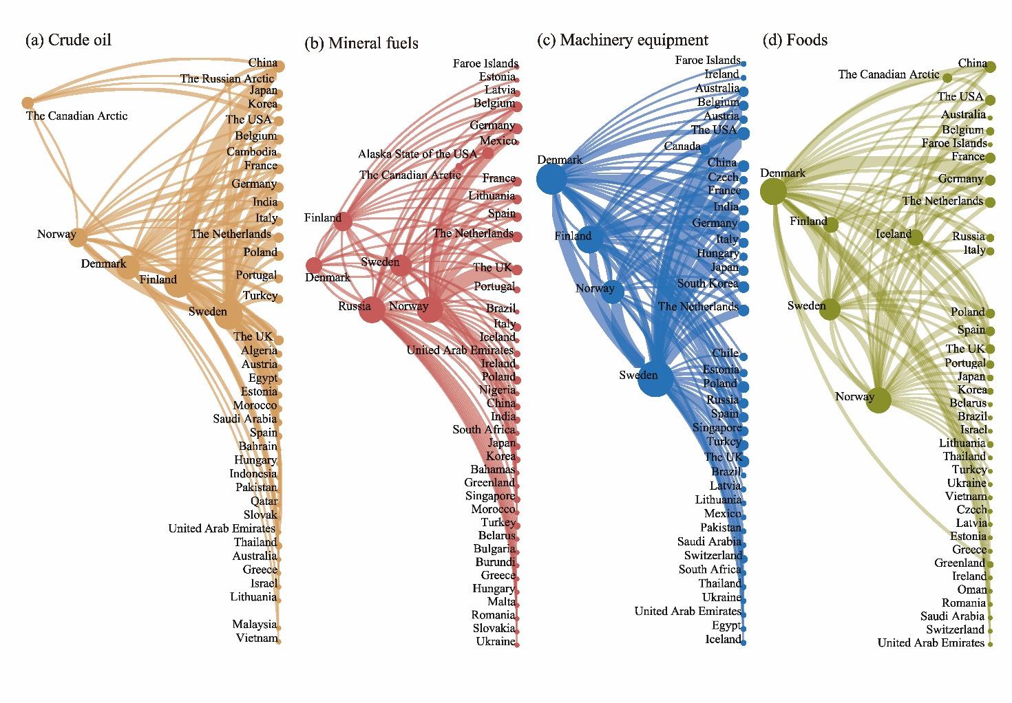 Fig. 6. Export trade network of primary products from the Arctic region in 2019. (a), crude oil; (b), mineral fuels; (c), machinery equipment; (d), foods. The size of each node indicates the trade intensity. Large nodes represent high trade intensity. The width of the connecting line indicates the intensity of trade flow between the nodes. The thicker the connecting line, the greater the intensity of trade flow between two nodes. |