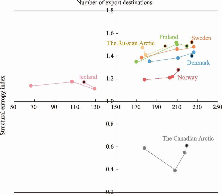 Fig. 7. Nodal degree and structural entropy distribution of export trade in the Arctic region from 1990, 2000, 2010 to 2019. The connecting line indicates the change in the position of the point, and the black dot represents the position in 2019. |