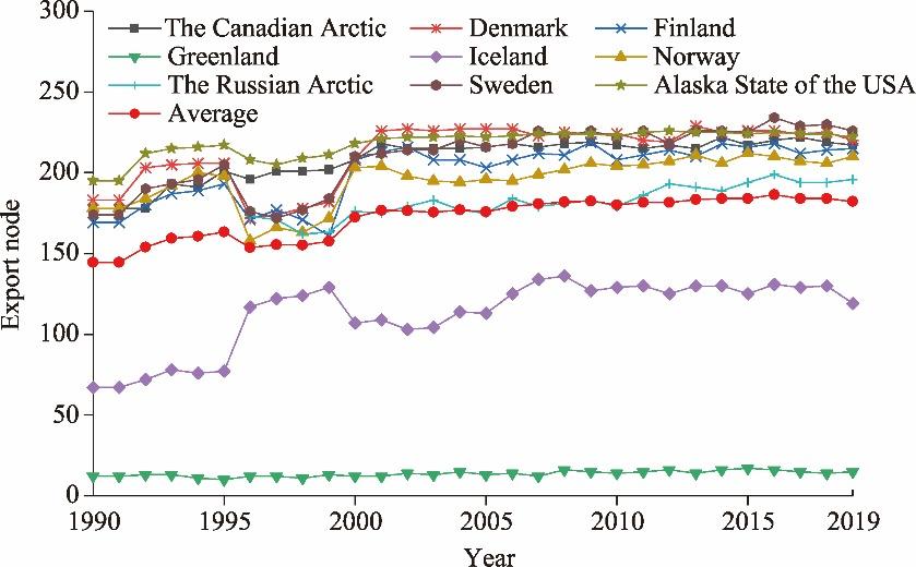 Fig. 3. Changes in the node degree of export trade in the Arctic region from 1990 to 2019. |