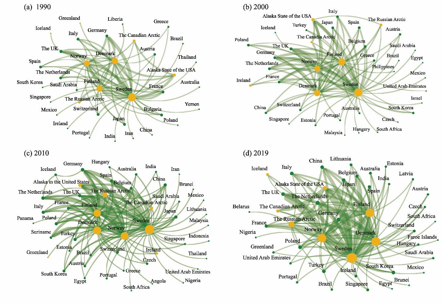 Fig. 4. Strength and structure of export trade in the Arctic region in 1990 (a), 2000 (b), 2010 (c), and 2019 (d). Yellow nodes indicate export regions, while green nodes denote import regions. Node size indicates the trade intensity; the larger the point, the greater the trade intensity. The width of connecting lines indicates the intensity of trade flow between nodes; the thicker the connecting line, the stronger the intensity of trade flow. |