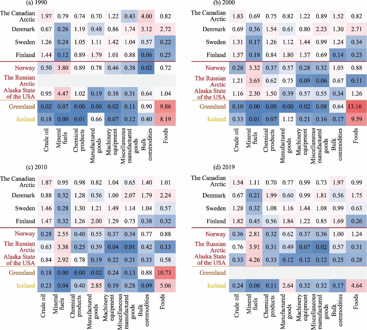 Fig. 8. Matrix of comparative advantage of the exports of the Arctic region. (a), 1990; (b), 2000; (c), 2010; (d), 2019. Red and blue colors indicate relatively high and low comparative advantage, respectively. The shaded area represents the year for which no trade data were recorded. |