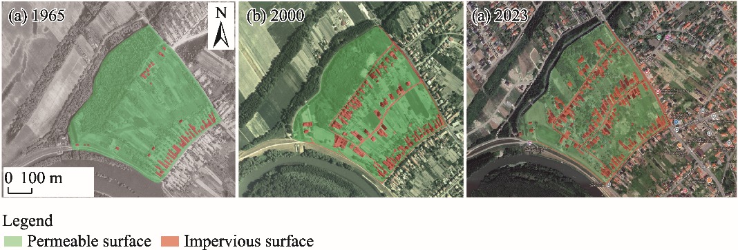 Fig. 2. Distribution of permeable and impervious surfaces in the first neighbourhood of Györzámoly in 1965 (a), 2000 (b), and 2023 (c). |