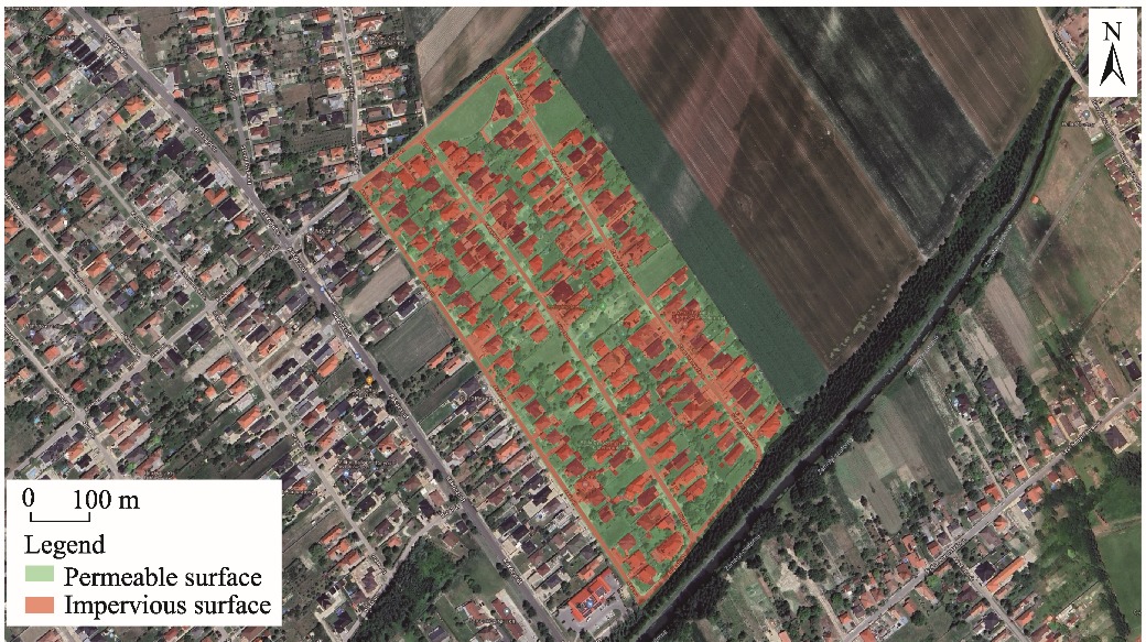 Fig. 3. Distribution of permeable and impervious surfaces in the second neighbourhood of Györzámoly in 2023. |