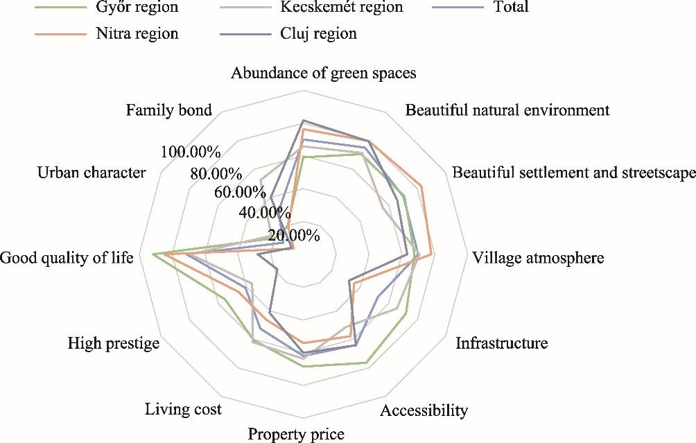 Fig. 5. Percentage of factors driving for moving to a settlement in the four city regions. |