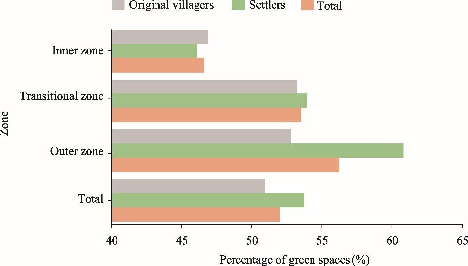 Fig. 6. Percentage of green spaces of original villagers and settlers in different zones of the four city regions. |