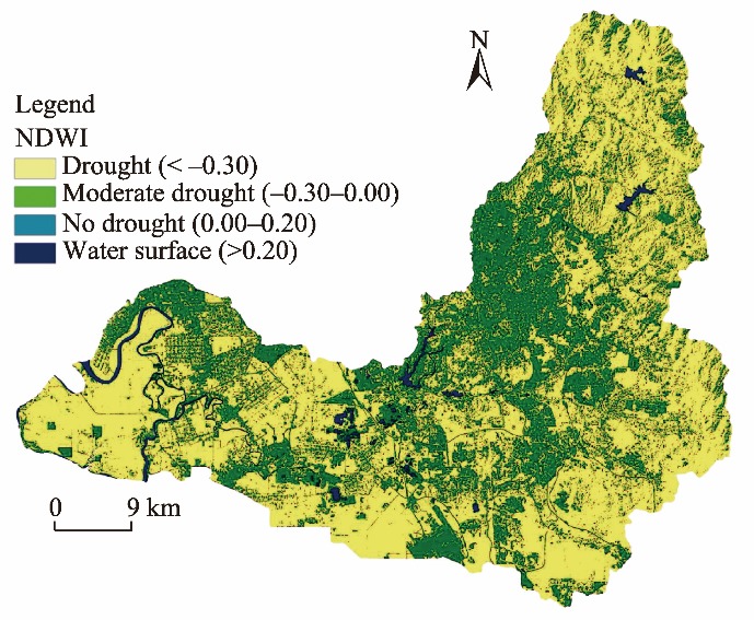 Fig. 1. Spatial distribution of the normalized difference water index (NDWI) in the study area. |