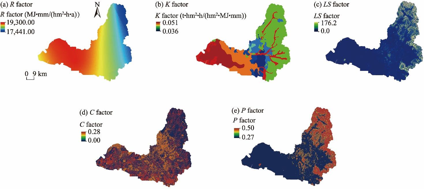 Fig. 2. Spatial distribution of soil erosion factors in the study area. (a), rainfall erosivity (R) factor; (b), soil erodibility (K) factor; (c), slope length and steepness (LS) factor; (d), land cover management (C) factor; (e), conservation support practice (P) factor. |