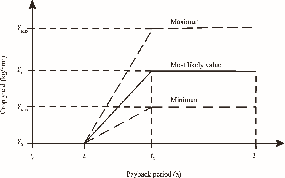 Fig. 2. Response pattern of crop yield and payback period of the implementation of Climate-Smart Agriculture (CSA) interventions. Y0 is the crop yield before the implementation of CSA interventions; Yf is the most likely crop yield after the implementation of CSA interventions; YMin is the minimum crop yield; YMax is the maximum crop yield; t0 is the time before the implementation of CSA interventions; t1 is initial time of the implementation of CSA interventions; t2 is the time achieving the maximum, most likely, and minimum crop yield of the implementation of the CSA interventions; and T is the total time of the implementation of CSA interventions. |
