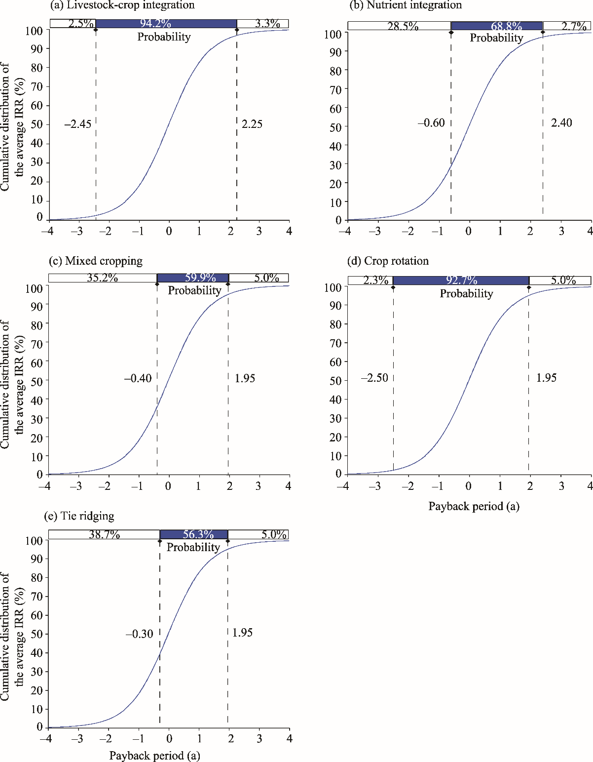 Fig. 3. Cumulative distribution of the average Internal Rate of Return (IRR) for the implementation of five CSA interventions. (a), livestock-crop integration; (b), nutrient integration; (c), mixed cropping; (d), crop rotation; (e), tie ridging. Negative values of payback period indicate that investment has been made but return has not yet been realized. |