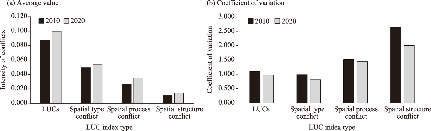 Fig. 4. Evolution of LUCs in the central Chengdu-Chongqing region in 2010 and 2020. (a), average value of LUC index; (b) coefficient of variation of LUC index. |