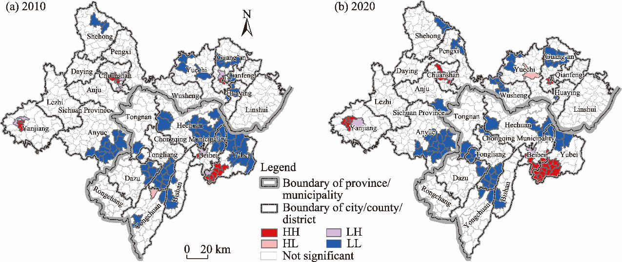 Fig. 5. Spatial agglomeration characteristics of LUCs in 2010 (a) and 2020 (b). Note that the figure is based on the standard map (No. GS(2024)0650) of the Map Service Center (https://www.tianditu.gov.cn/) marked by the Ministry of Natural Resources of the People’s Republic of China, and the standard map used in this study has not been modified. HH, the attribute values of the study region and surrounding region are both high; HL, the high-value region is surrounded by the low-value region; LH, the low-value region is surrounded by the high-value region; LL, the attribute values of the study region and surrounding region are both low. |