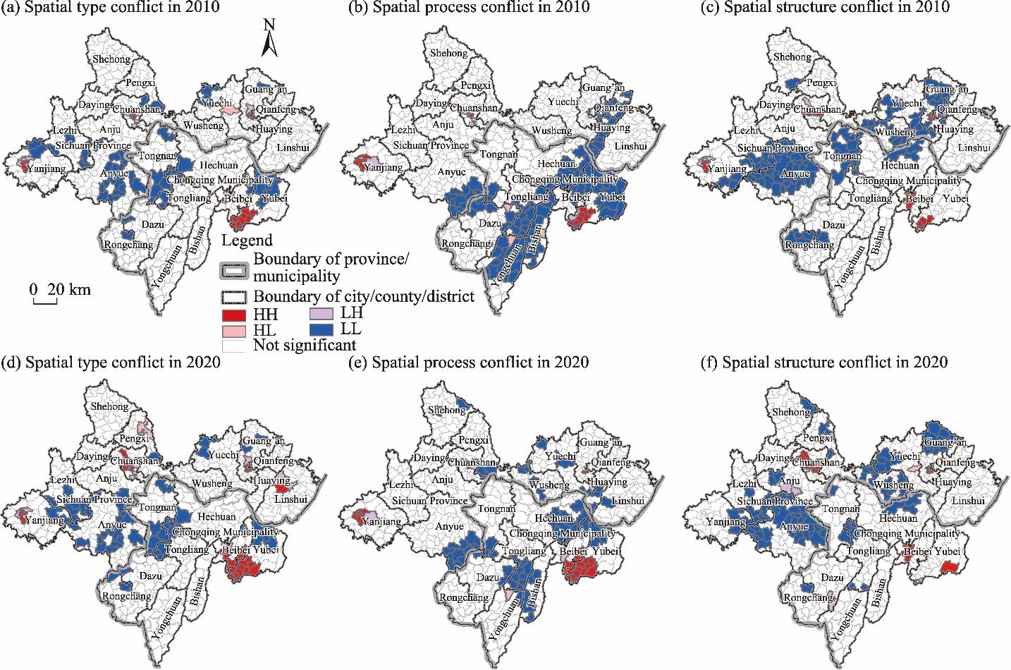 Fig. 6. Spatial agglomeration characteristics of spatial type conflict, spatial process conflict, and spatial structure conflict in 2010 and 2020. (a), spatial type conflict in 2010; (b), spatial process conflict in 2010; (c), spatial structure conflict in 2010; (d), spatial type conflict in 2020; (e), spatial process conflict in 2020; (f), spatial structure conflict in 2020. Note that the figure is based on the standard map (No. GS(2024)0650) of the Map Service Center (https://www.tianditu.gov.cn/) marked by the Ministry of Natural Resources of the People’s Republic of China, and the standard map used in this study has not been modified. |