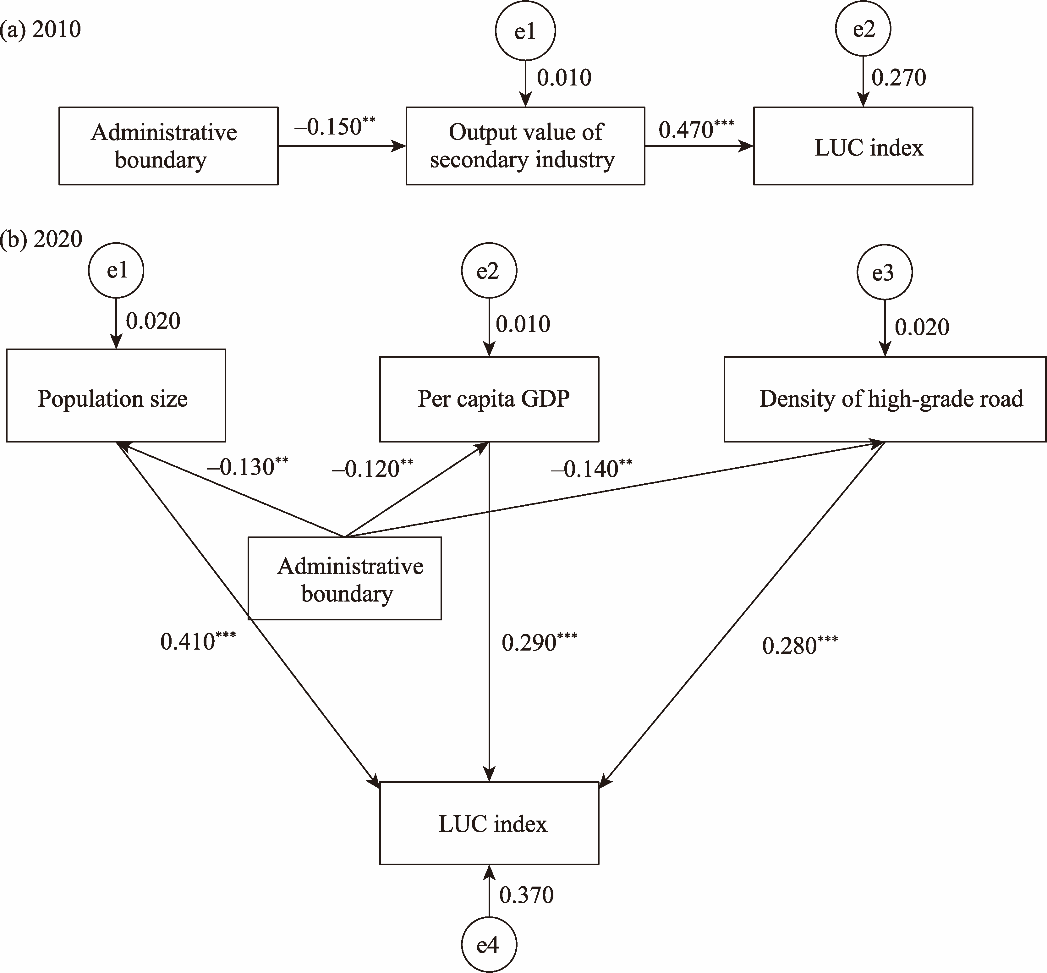 Fig. 7. SEM results of the impacts of administrative boundary on LUCs. (a), results of SEM in 2010; (b), results of SEM in 2020. In Figure 7a, e1 and e2 represent the residuals of the output value of the secondary industry and LUC index, respectively. In Figure 7b, e1, e2, e3, and e4 represent the residuals of population size, per capita GDP, the density of high-grade road, and LUC index, respectively. The value above the arrow is the regression coefficient. ** and *** indicate statistical significance at the P≤0.05 and P≤0.01 levels, respectively. |