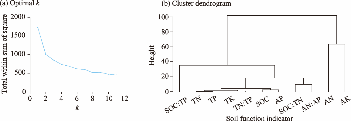 | Fig. 1. Clustering diagram of soil function indicators. (a), determining the optimal number of clusters (k); (b), a dendrogram of soil function indicators showing four main clusters. SOC, soil organic carbon; TN, total nitrogen; TP, total phosphorus; TK, total potassium; AN, available nitrogen; AP, available phosphorus; AK, available potassium. |