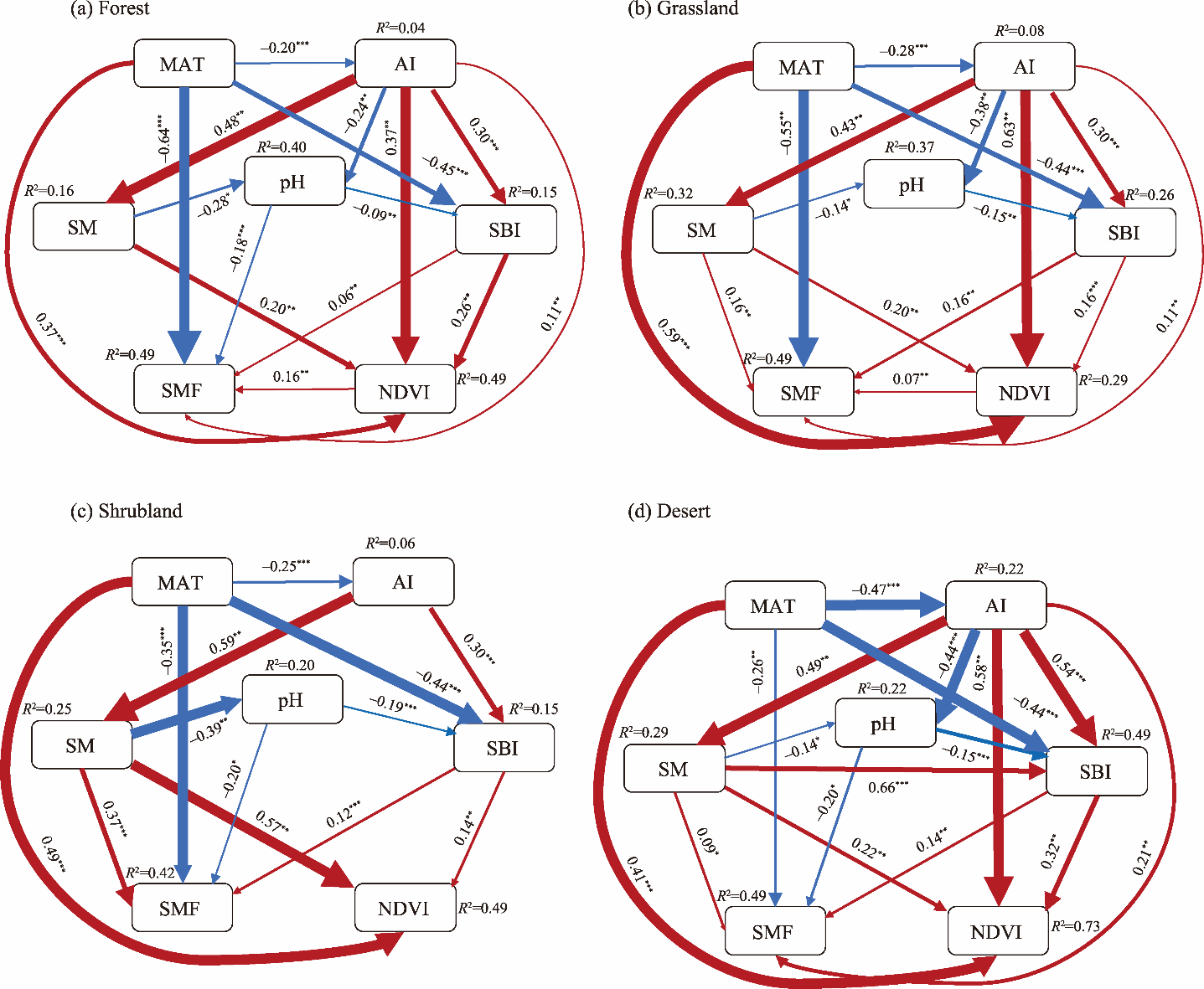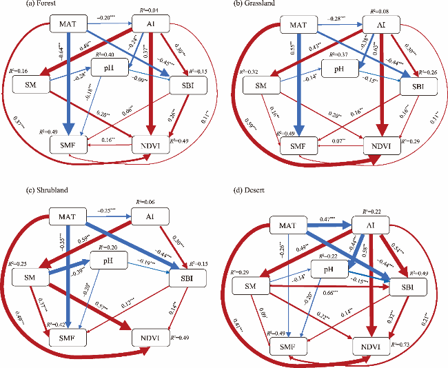| Fig. 4. Structural equation modeling (SEM) showing the impacts of climate factors, soil factors, and vegetation on the SMF under different LULC types. (a), forest; (b), grassland; (c), shrubland; (d), desert. The red and blue lines indicate positive and negative relationships, respectively. The thickness of the line is proportional to the size of the normalized path coefficient and indicates the strength of the relationship. The arrow represents the direction of the effect. The value on the arrow indicates the effect size. *, P<0.05; **, P<0.01; ***, P<0.001. |