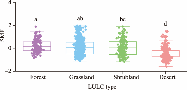 | Fig. 2. Soil multifunctionality (SMF) in the drylands of China under different land use and land cover (LULC) types. The dot represents the data value; the top, middle, and bottom lines of the box represent the upper quartile, median, and lower quartile, respectively; the upper whisker represents the upper quartile+1.5IQR (interquartile range); and the lower whisker represents the lower quartile-1.5IQR. Different lowercase letters indicate significant differences among different LULC types at P<0.05 level. |