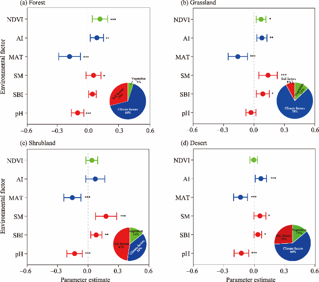 | Fig. 3. Impacts of climate factors (MAT and AI), soil factors (pH, SM, and SBI), and vegetation (NDVI) on the SMF under different LULC types. (a), forest; (b), grassland; (c), shrubland; (d), desert. The pie chart reflects the relative importance of climate factors, soil factors, and vegetation to the SMF. NDVI, normalized difference vegetation index; AI, aridity index; MAT, mean annual temperature; SM, soil moisture; SBI, soil biodiversity index; *, P<0.05; **, P<0.01; ***, P<0.001. Error bar represents the standard deviation. |
