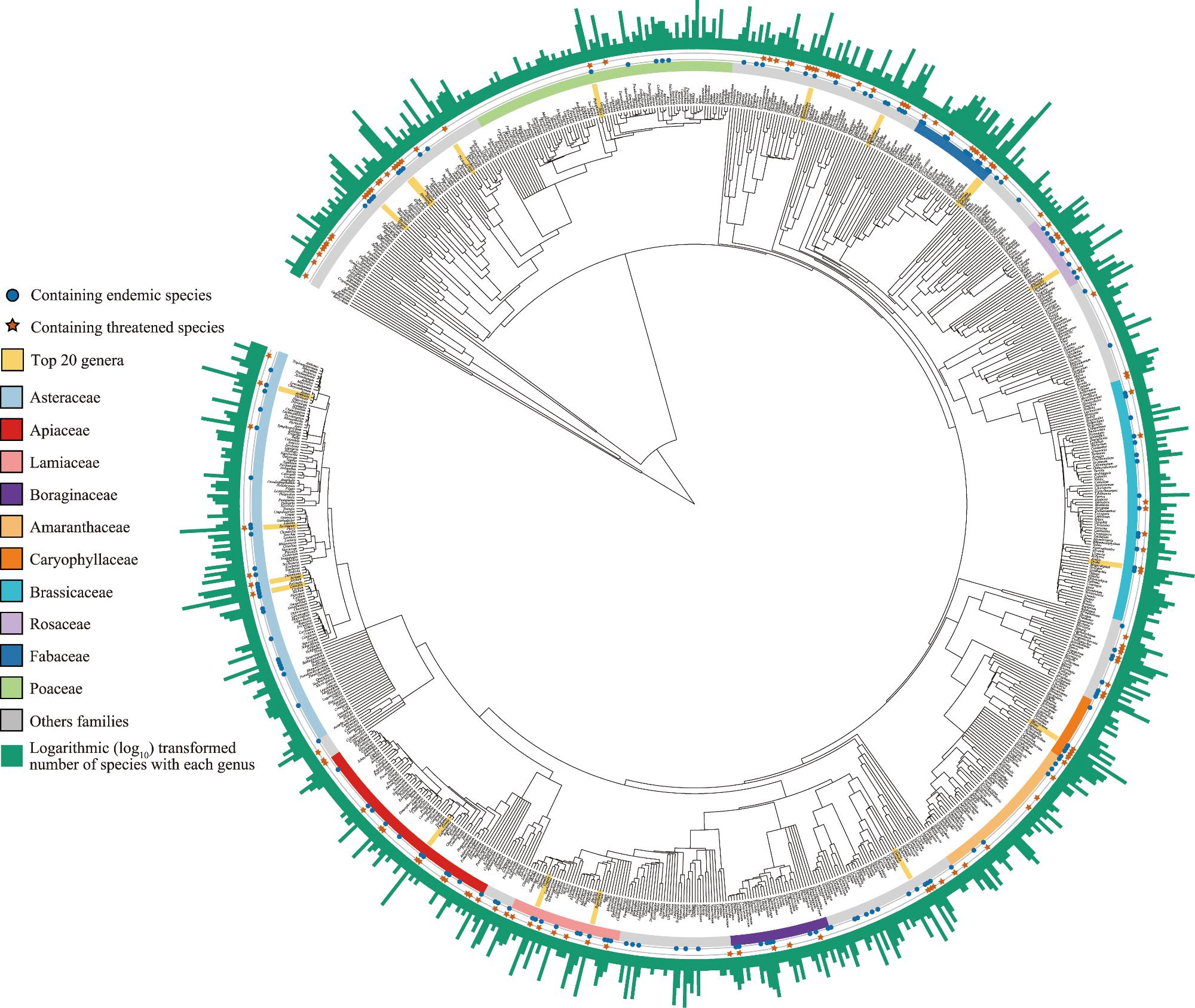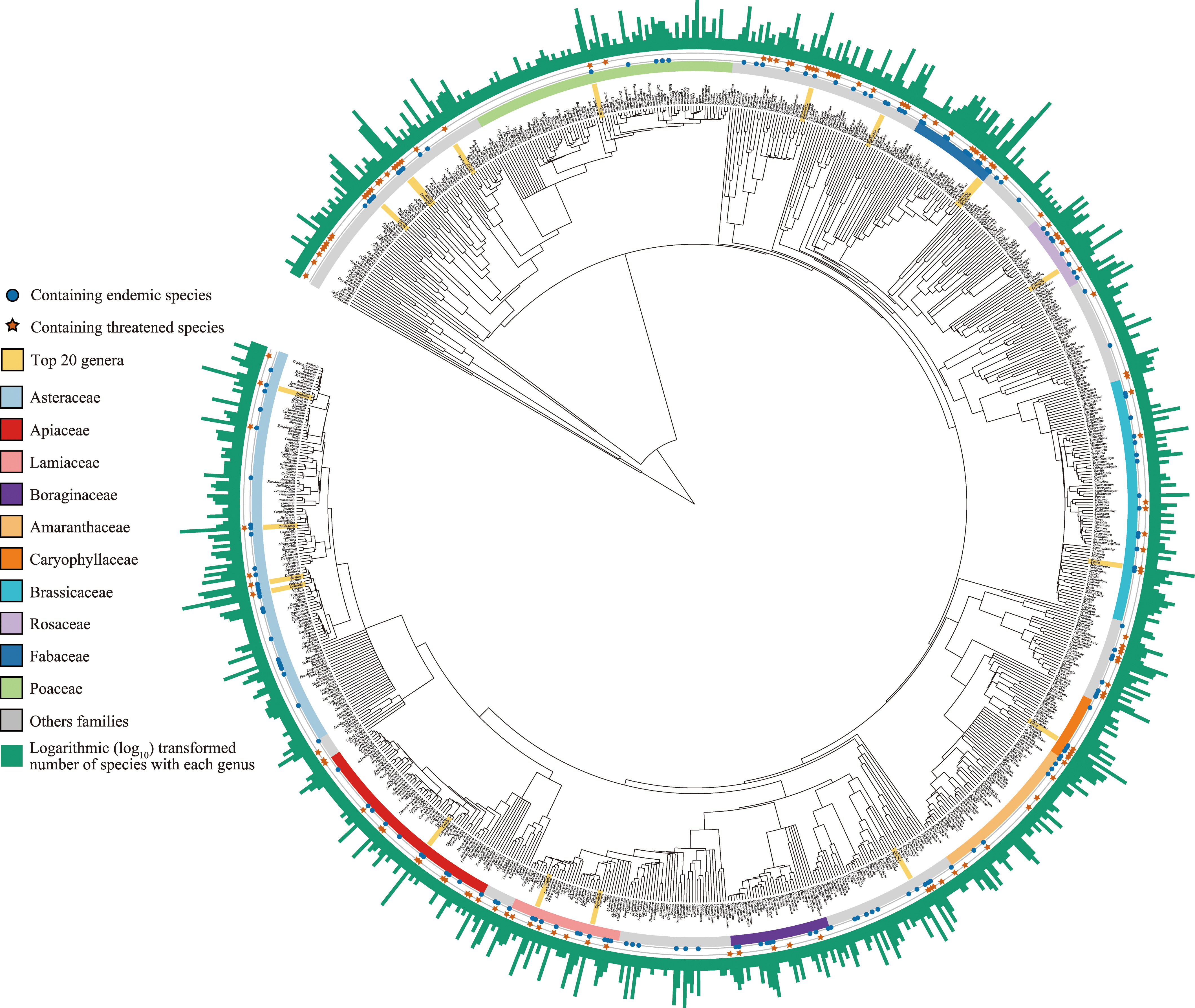 Fig. 2. Genus-level phylogenetic tree of vascular plants in Tajikistan. Genera highlighted in yellow color represent the top 20 genera with the most species richness (SR). Blue circles indicate genera containing endemic species, while brown-red stars denote genera containing threatened species. The colored sectors in the inner ring represent the top 10 families with the greatest SR. The outermost ring displays the logarithmic (log10) transformed the number of species within each genus. |