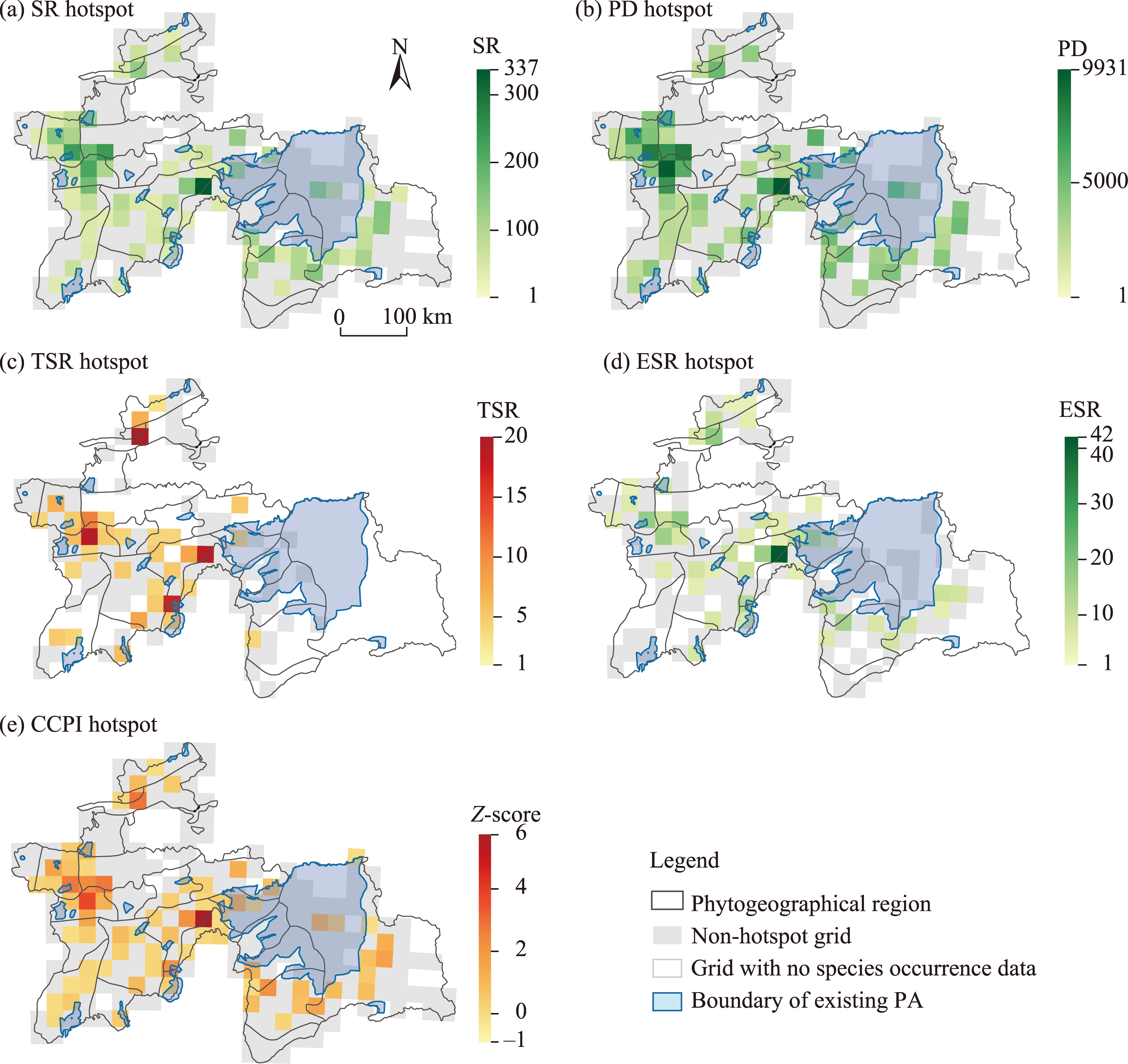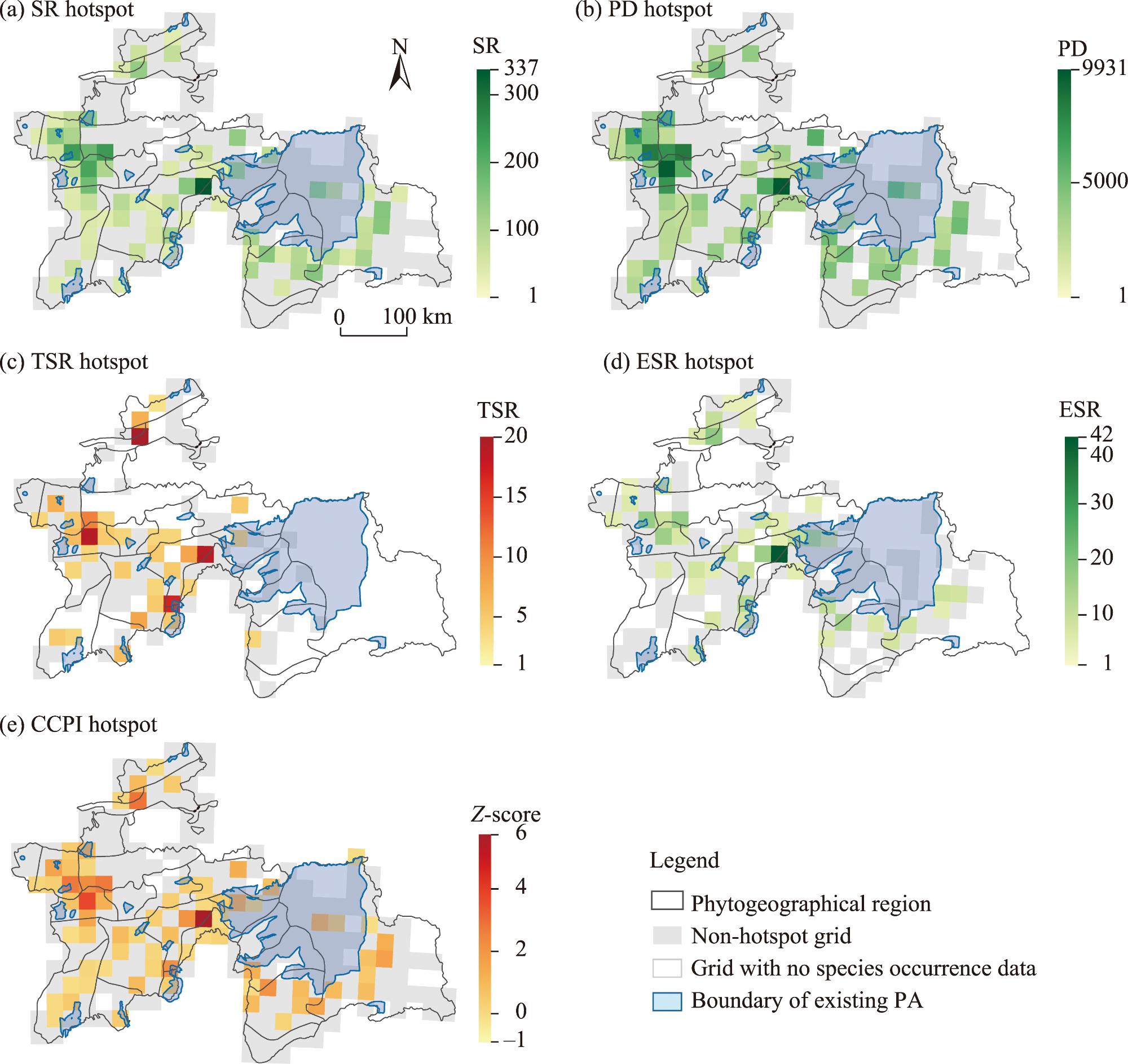 Note: SR, species richness; ESR, endemic species richness; TSR, threatened species richness; PD, phylogenetic diversity; CCPI, composite conservation priority index. Hotspot grids represent the top 30.00% of grid cells for each diversity index. Percentage of protection area and conservation gap area were calculated by overlaying hotspot grids with protected area (PA) boundary from the World Database on Protected Areas (WDPA). |