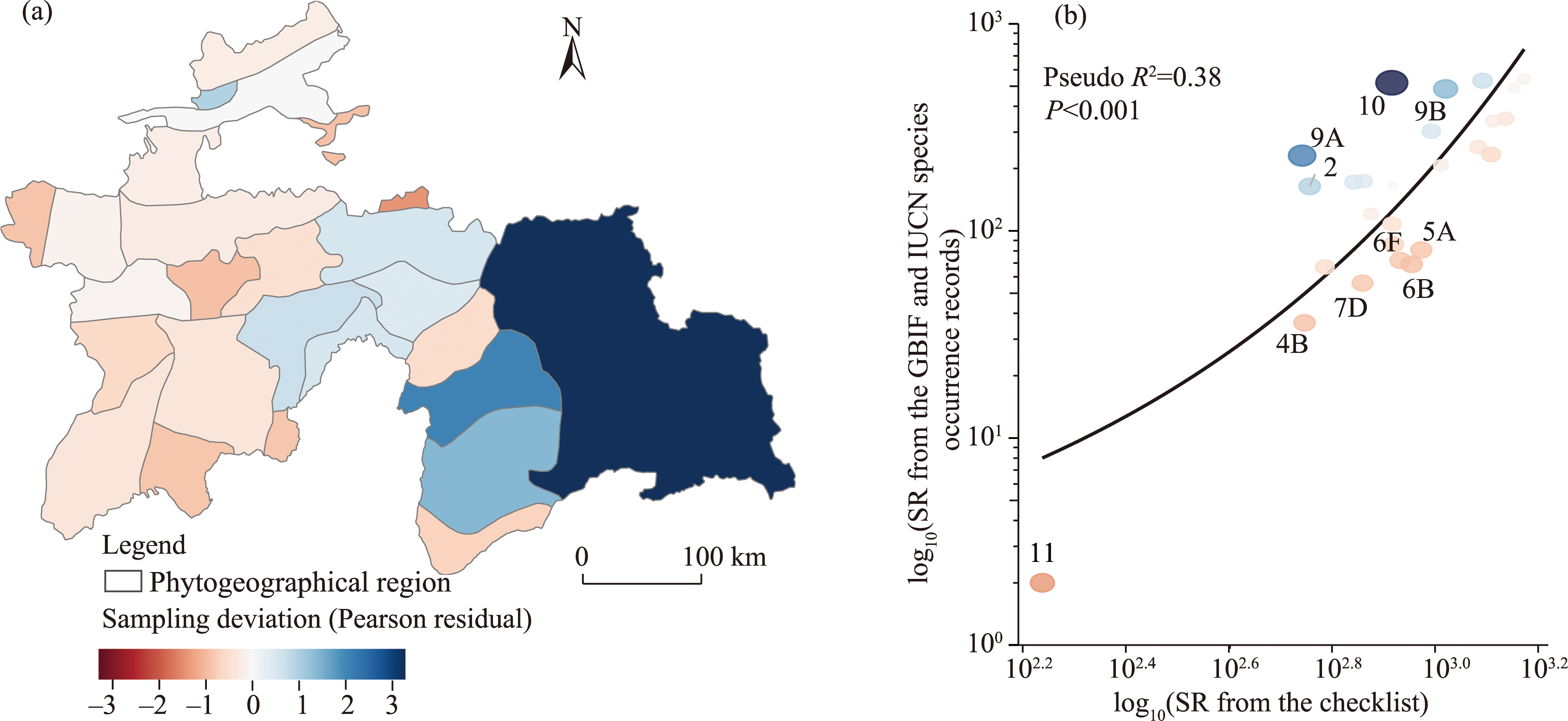 Fig. 6. Spatial distribution of sampling deviation of GBIF and IUCN species occurrence records (a) and fitted negative binomial regression curve between SR from the GBIF and IUCN species occurrence records and SR from the checklist (b) for vascular plants in Tajikistan. In Figure 6a, red region indicates under-sampled region (negative residual) where SR from the GBIF and IUCN species the occurrence record is significantly lower than SR from the checklist, while blue zone shows relatively well-sampled region (positive residual). |