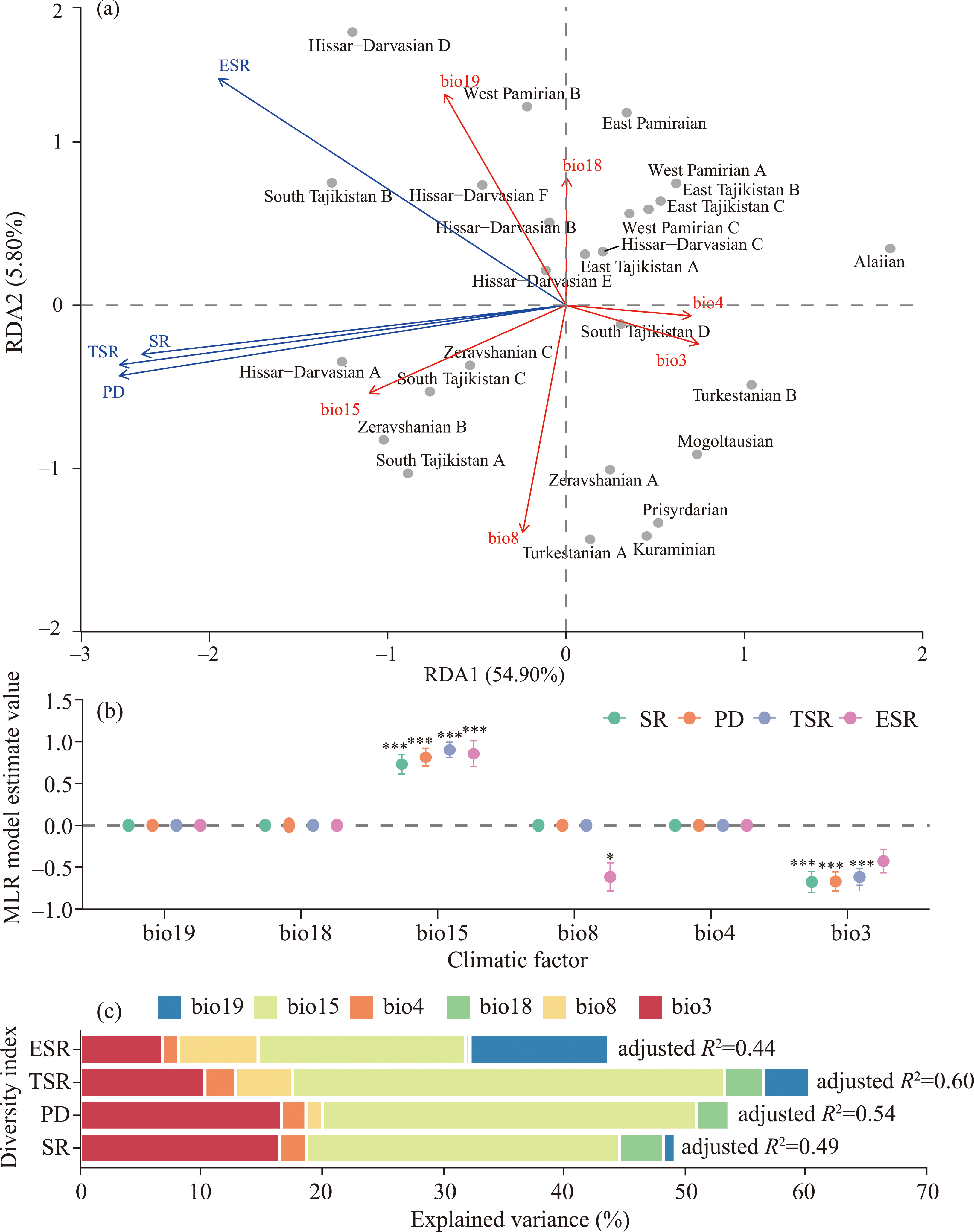 Fig. 7. Relationships among diversity index, climatic factor, and phytogeographic region for vascular plants in Tajikistan. (a), relationship among diversity index, climatic factor, and phytogeographic regions based on redundancy analysis (RDA); (b), best-fit multiple linear regression (MLR) model of diversity indices and climatic factors; (c), contribution of climatic factors to each diversity index. bio3, isothermality; bio4, temperature seasonality; bio8, mean temperature of the wettest quarter; bio15, precipitation seasonality; bio18, precipitation of the warmest quarter; bio19, precipitation of the coldest quarter. In Figure 7a, arrow length and direction indicate the strength and direction of correlations with ordination axes, respectively. Percentage in parentheses represents the proportion of the total variation explained by each axis. In Figure 7b, point represents coefficient values. Error bar indicates ±1 standard error. The vertical dashed line denotes the zero-reference line. *, P≤0.050; ***, P≤0.001. Bar length represents the percentage of independently explained variation, with different colors corresponding to different climatic factors. |