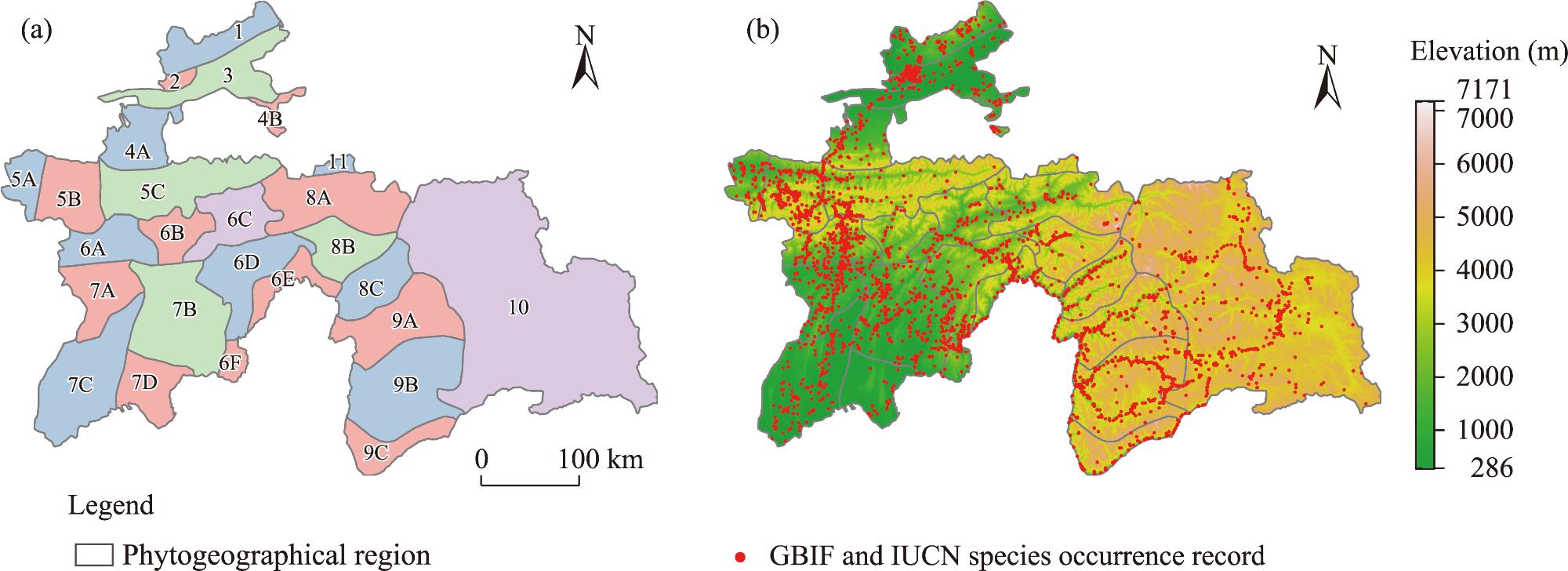 Fig. 1. Spatial distribution of phytogeographic regions (a) and quality-controlled vascular plant occurrence records (b). 1, Kuraminian; 2, Mogoltausian; 3, Prisyrdarian; 4A, Turkestanian A; 4B, Turkestanian B; 5A, Zeravshanian A; 5B, Zeravshanian B; 5C, Zeravshanian C; 6A, Gissar-Darvasian A; 6B, Gissar-Darvasian B; 6C, Gissar-Darvasian C; 6D, Gissar-Darvasian D; 6E, Gissar-Darvasian E; 6F, Gissar-Darvasian F; 7A, South Tadzhikistanian A; 7B, South Tadzhikistanian B; 7C, South Tadzhikistanian C; 7D, South Tadzhikistanian D; 8A, East Tadzhikistanian A; 8B, East Tadzhikistanian B; 8C, East Tadzhikistanian C; 9A, West Pamirian A; 9B, West Pamirian B; 9C, West Pamirian C; 10, East Pamirian; 11, Alajian. These regions were defined following the classification system established by Goncharov in the Flora Tadzhikskoi SSR (Ovchinnikov, 1957-1991). GBIF, Global Biodiversity Information Facility; IUCN, International Union for Conservation of Nature. Abbreviations are defined in the figure and are consistent in subsequent figures. Note that the figure is based on the standard map (GS(2025)1508) of the Map World (https://map.tianditu.gov.cn) marked by the National Platform for Common GeoSpatial Information Services, and the boundary of the standard map has not been modified. |
