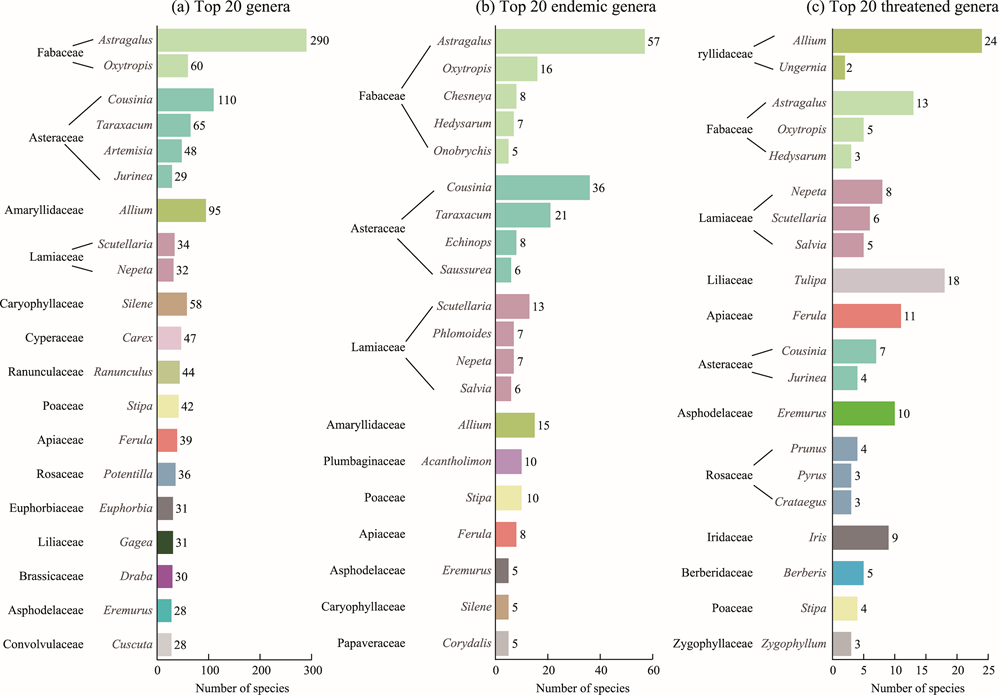 Fig. 3. Top 20 genera (a), top 20 endemic genera (b), and top 20 threatened genera (c) with the most number of species in Tajikistan. Each bar is color-coded by family, demonstrating the taxonomic distribution of diversity across different plant lineages. Genera are ranked in descending order of species number within each category. |