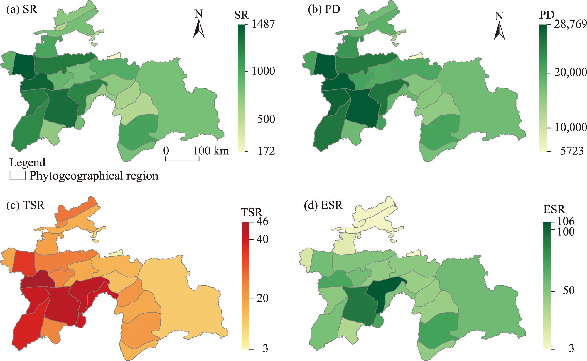 Fig. 4. Geographic distribution patterns of SR (a), PD (b), TSR (c), and ESR (d) in Tajikistan. SR, species richness; PD, phylogenetic diversity; TSR, threatened species richness; ESR, endemic species richness. |
