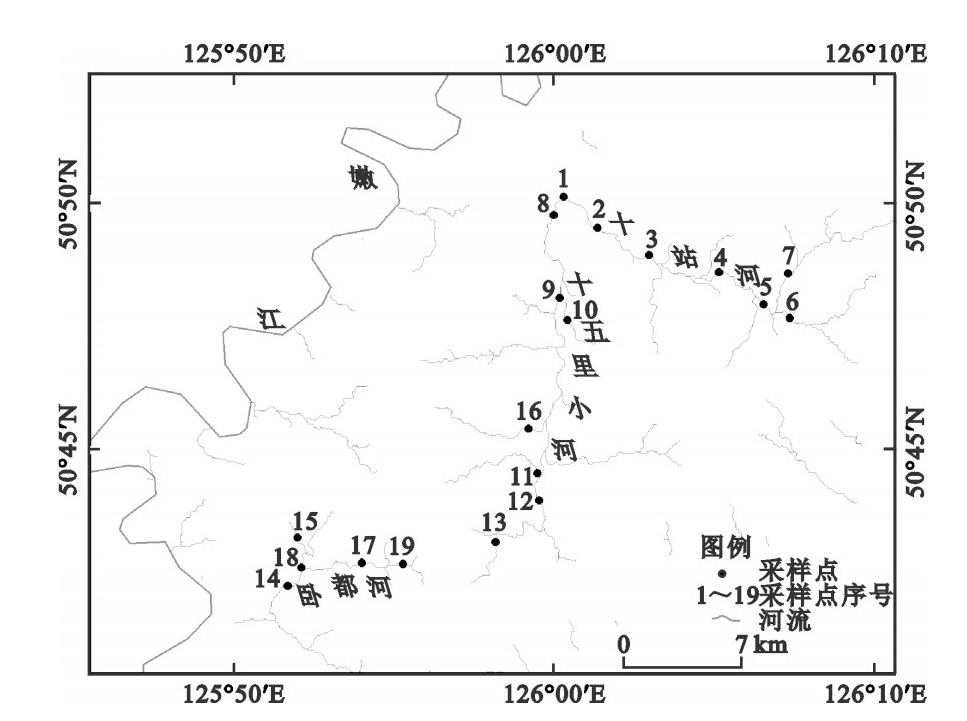 | 十站河 | 采样点1至采样点7 | 采样点1至采样点4位于十站河干流,河宽约3~15 m,流速较快,周围植被为草甸和灌木;采样点5至采样点7位于河流上游的支流,河宽约1~2 m,流速缓慢,周围植被为乔木和灌丛。河流底质主要为砾石和沙石,部分采样点为淤泥,含有较多腐殖质。 |