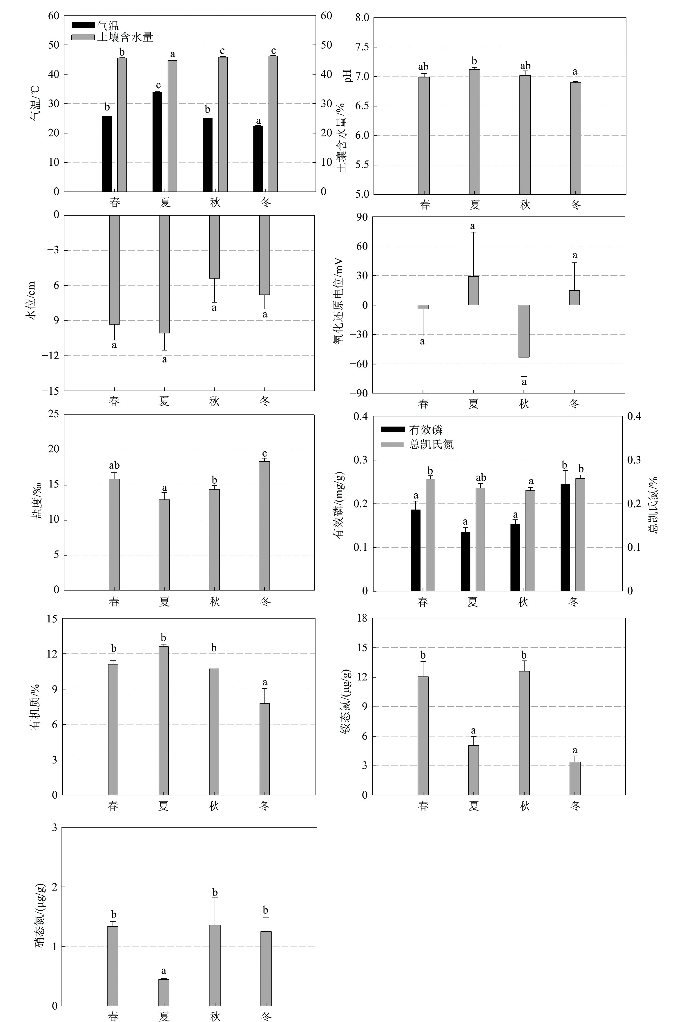 | 注:数据为平均值±标准误差;同一行不同字母表示在不同空间位置或不同季节之间差异显著(p<0.05)。 | |||||||