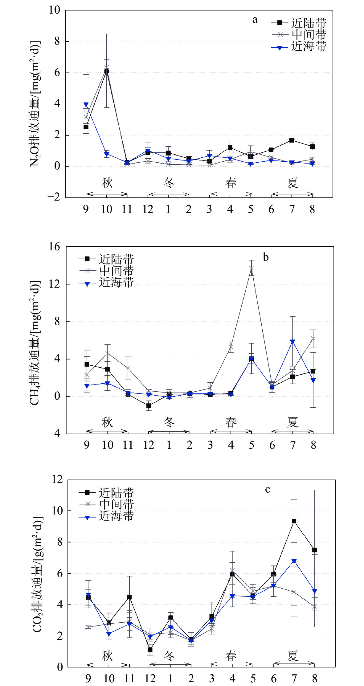 3 Monthly variations of soil N2O, CH4 and CO2 fluxes at three tidal positions in Mai Po mangrove wetland, Hong Kong香港米埔红树林湿地不同空间位置N2O、CH4 和CO2排放通量的月变化 |