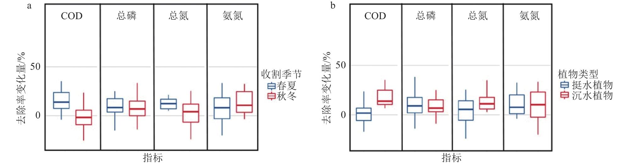 1 Variation in pollutant removal rate after harvesting across different seasons (a) and types of plants (b)不同季节(a)、不同类型植物(b)收割后污染物去除率变化量 [ |