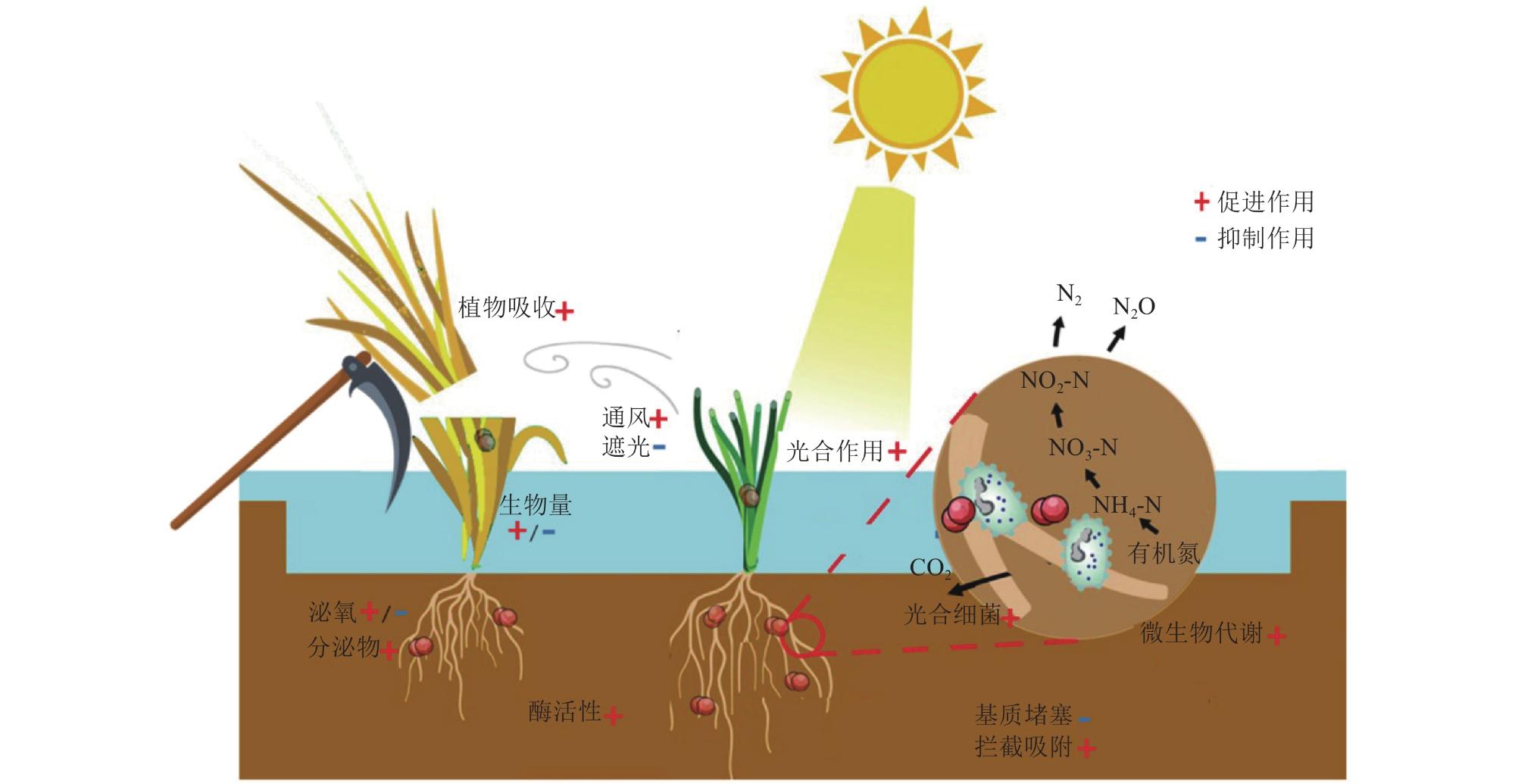 湿地植物是人工湿地系统发挥水质净化功能的重要组成部分。人工湿地中的植物枯萎后不及时收割会引发二次污染,甚至造成湿地堵塞,影响湿地系统稳定运行。本文综述了植物收割对人工湿地系统运行效果的影响,分析了植物收割影响污染物去除的机理,总结了不同种类植物的收割管理策略。植物收割对水质影响的季节性波动显著,春夏季收割可稳定提升人工湿地系统化学需氧量、总氮等污染物的去除效果,秋冬季收割则有利于总磷和氨氮的去除,但对化学需氧量、总氮的影响波动性较大。收割不仅会直接影响植物的生产力和生物学特征,还能通过改变植物根系泌氧水平、基质酶活性等间接影响湿地理化环境和微生物代谢过程,从而对植物−微生物−基质耦合作用和污染物的地球化学循环过程产生影响。植物收割对人工湿地运行的影响主要取决于收割时间、收割方式、收割频次、收割程度以及植物种类,在进行植物收割时应根据植物类型、湿地实际情况等选择适宜的收割策略。