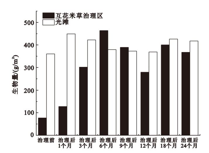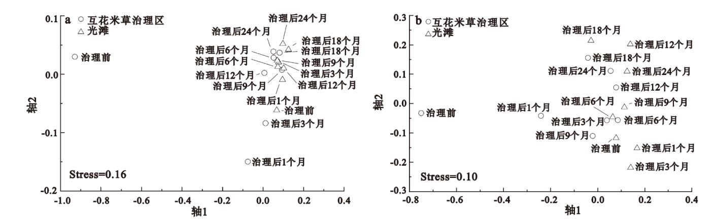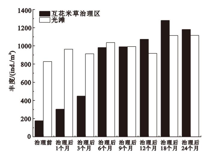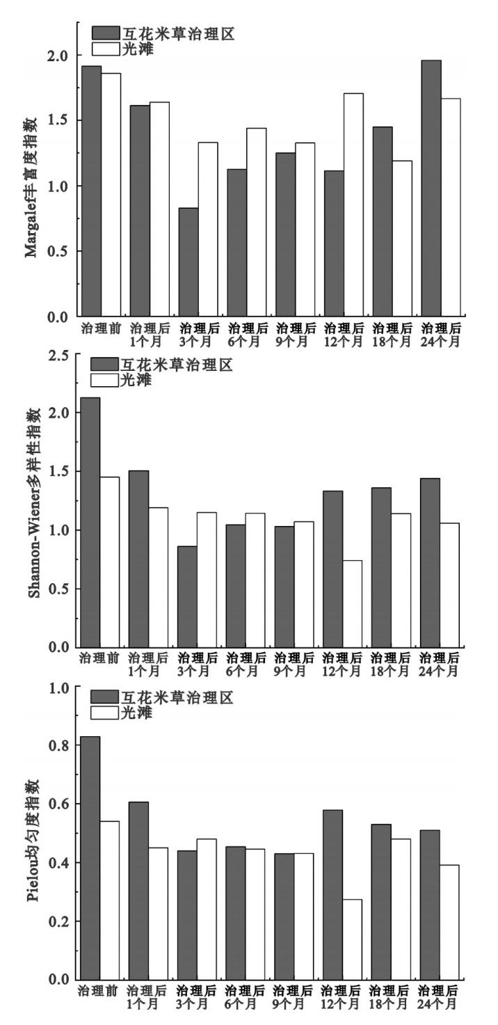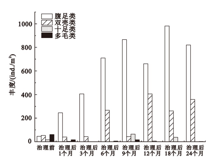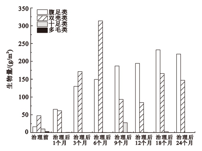| 治理后 24个月 | 托氏䗉螺(0.59)、秀丽织纹螺(0.07)、红明樱蛤(0.05)、苍白亮樱蛤(0.03) | 托氏䗉螺(0.76)、秀丽织纹螺(0.09)、红明樱蛤(0.05) |