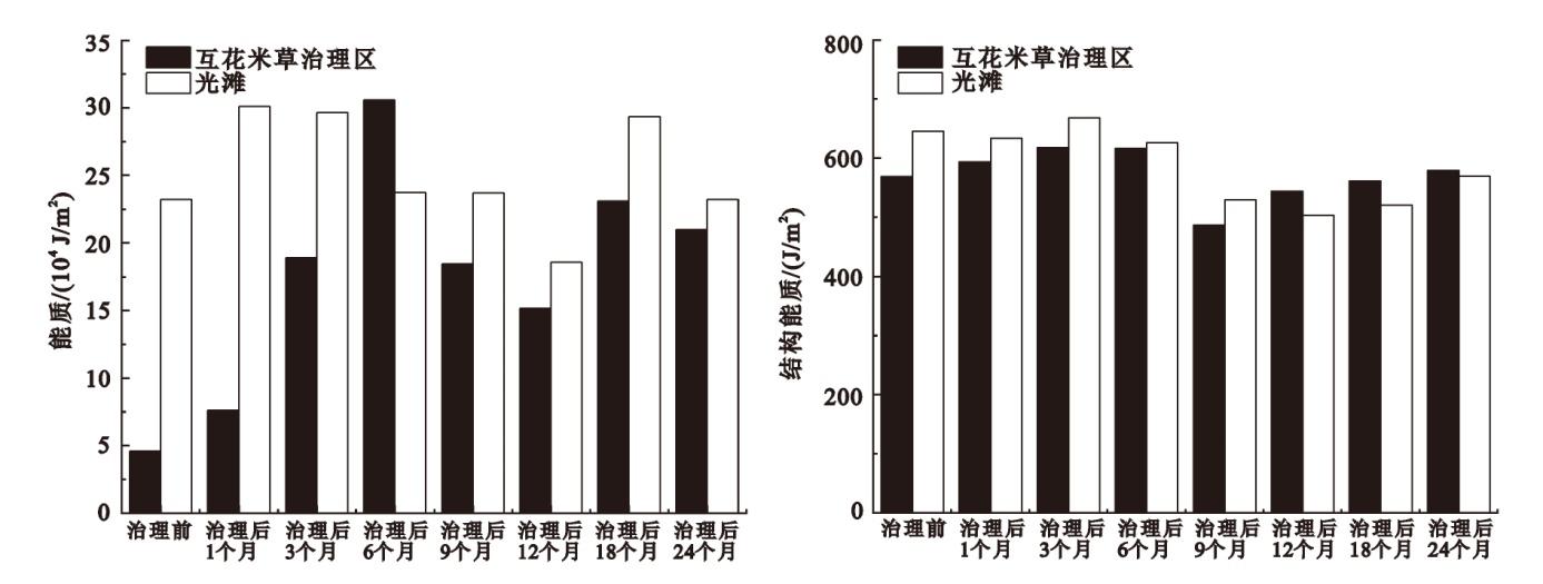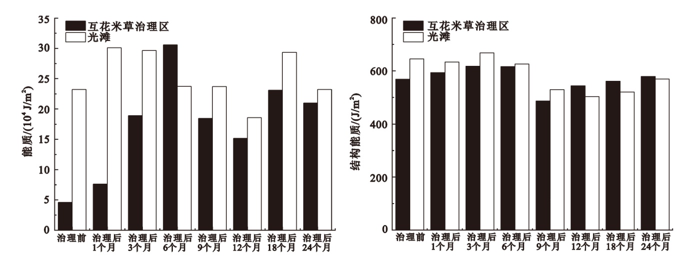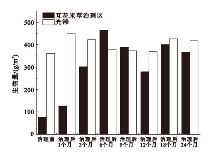 | 治理前 | 双齿围沙蚕(0.23)、光滑河蓝蛤(0.10)、托氏䗉螺(0.06)、秀丽织纹螺(0.04)、青蛤(0.03)、绒毛近方蟹(0.03)、短滨螺(0.03)、四角蛤蜊(0.02)、红明樱蛤(0.02) | 托氏䗉螺(0.65)、红明樱蛤(0.08)、吻沙蚕(0.05)、秀丽织纹螺(0.04)、四角蛤蜊(0.03)、江户明樱蛤(0.03)、青蛤(0.02) |